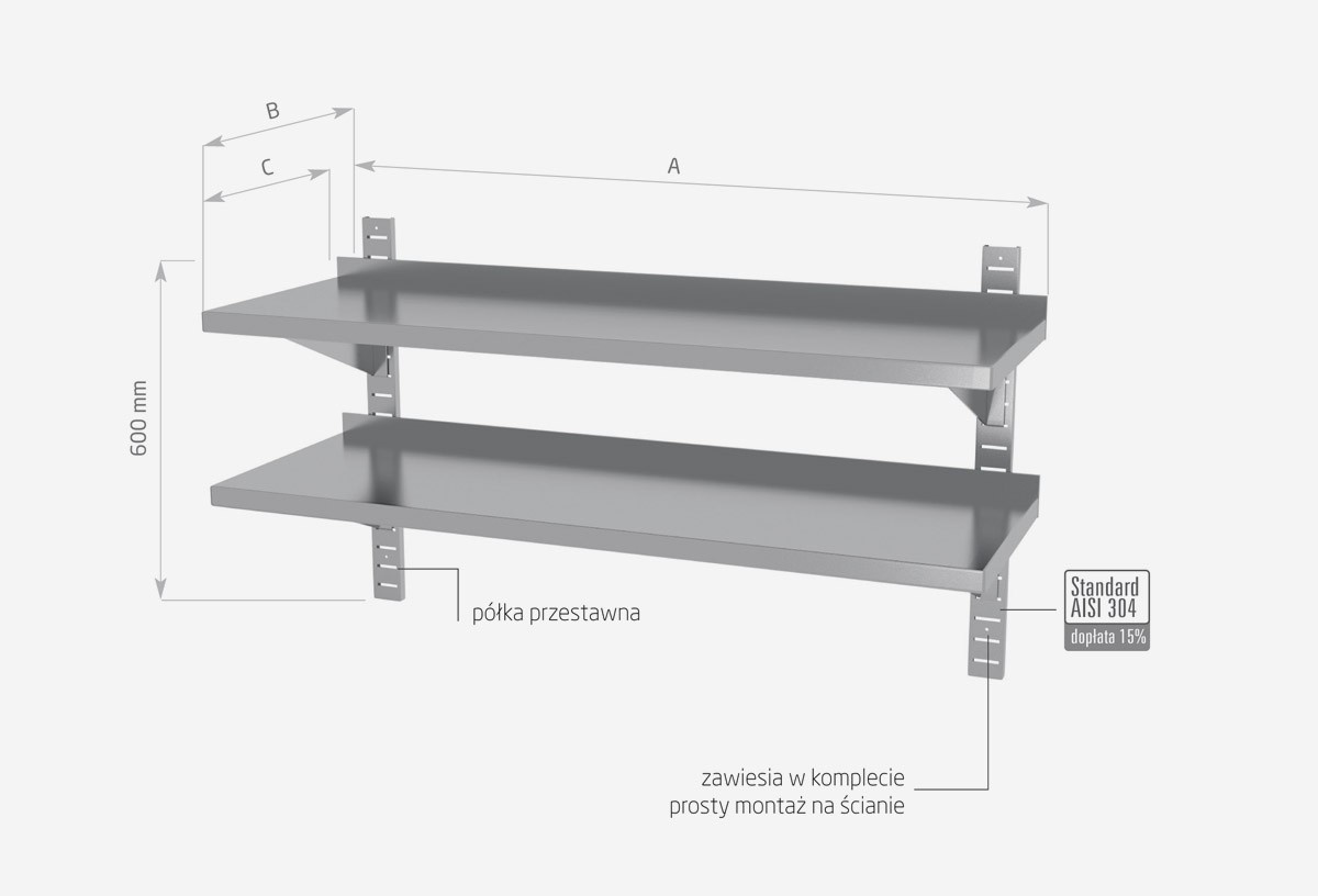 Standardowo nasze wyroby wykonane są ze stali nierdzewnej AISI 430, a elementy narażone na najsilniejsze działanie środków chemicznych i organicznych wykonujemy ze stali nierdzewnej tzw. kwasówki AISI 304. Wszystkie nasze meble mogą być również w całości wykonane z tego materiału, dopłaty do standardu AISI 304 zostały podane każdorazowo przy meblu.