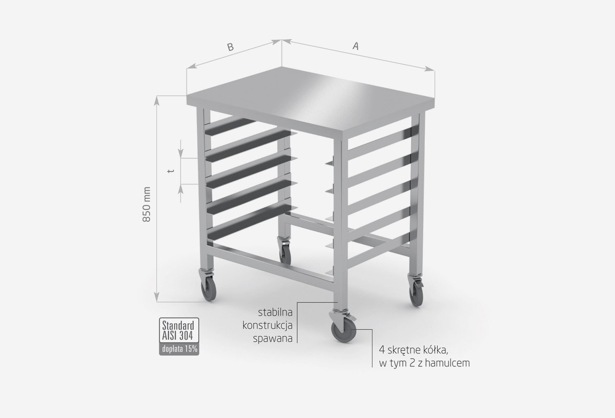 Standardowo nasze wyroby wykonane są ze stali nierdzewnej AISI 430, a elementy narażone na najsilniejsze działanie środków chemicznych i organicznych wykonujemy ze stali nierdzewnej tzw. kwasówki AISI 304. Wszystkie nasze meble mogą być również w całości wykonane z tego materiału, dopłaty do standardu AISI 304 zostały podane każdorazowo przy meblu.