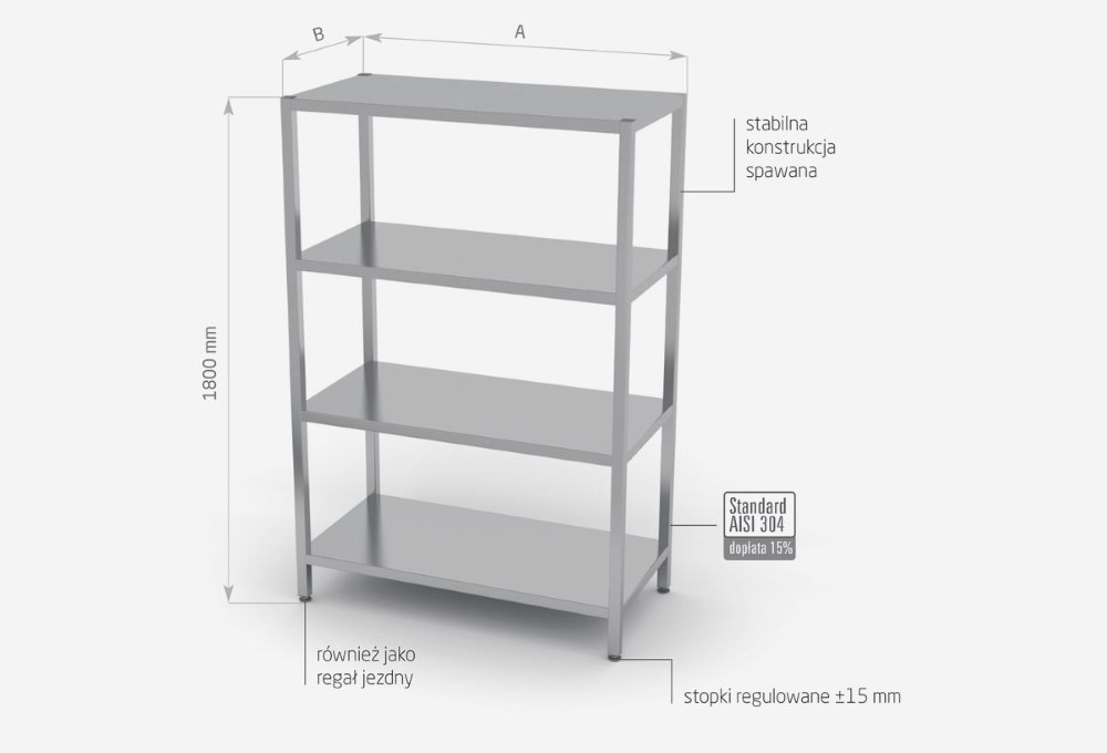 Standardowo nasze wyroby wykonane są ze stali nierdzewnej AISI 430, a elementy narażone na najsilniejsze działanie środków chemicznych i organicznych wykonujemy ze stali nierdzewnej tzw. kwasówki AISI 304. Wszystkie nasze meble mogą być również w całości wykonane z tego materiału, dopłaty do standardu AISI 304 zostały podane każdorazowo przy meblu.