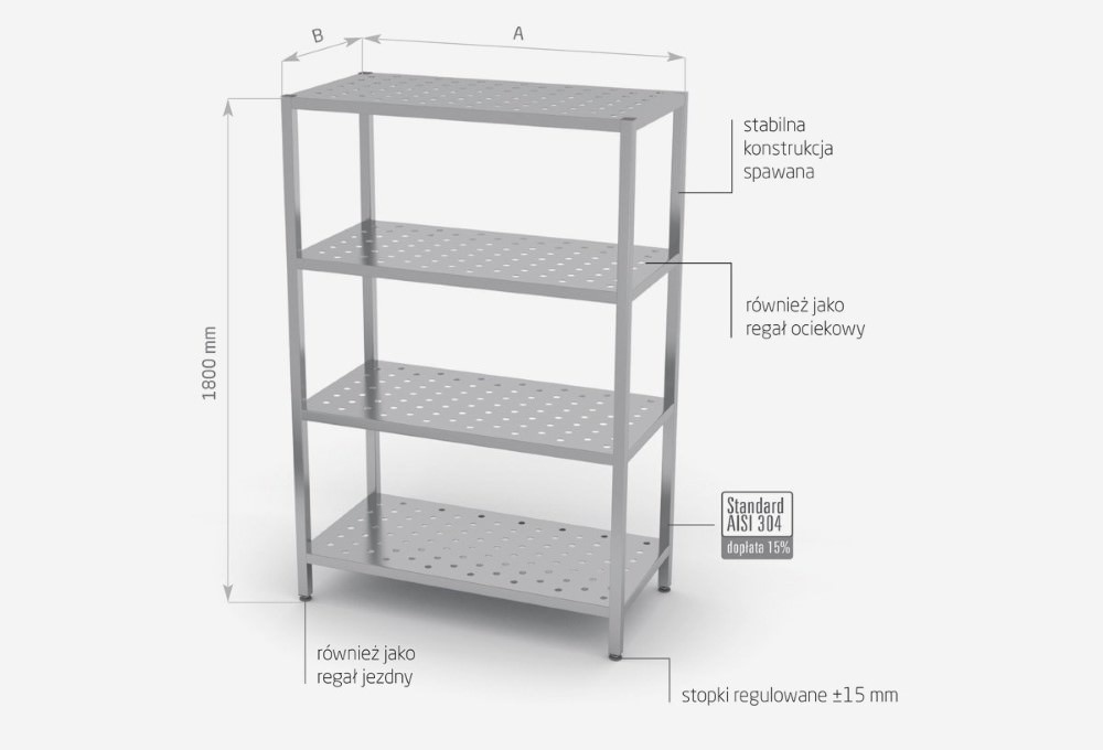 Standardowo nasze wyroby wykonane są ze stali nierdzewnej AISI 430, a elementy narażone na najsilniejsze działanie środków chemicznych i organicznych wykonujemy ze stali nierdzewnej tzw. kwasówki AISI 304. Wszystkie nasze meble mogą być również w całości wykonane z tego materiału, dopłaty do standardu AISI 304 zostały podane każdorazowo przy meblu.