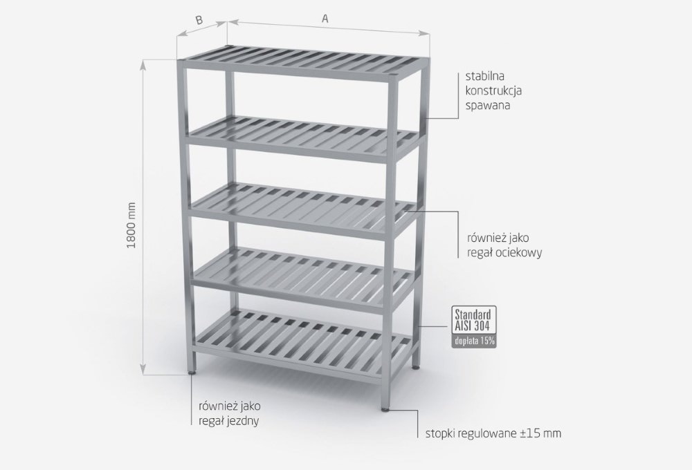 Standardowo nasze wyroby wykonane są ze stali nierdzewnej AISI 430, a elementy narażone na najsilniejsze działanie środków chemicznych i organicznych wykonujemy ze stali nierdzewnej tzw. kwasówki AISI 304. Wszystkie nasze meble mogą być również w całości wykonane z tego materiału, dopłaty do standardu AISI 304 zostały podane każdorazowo przy meblu.