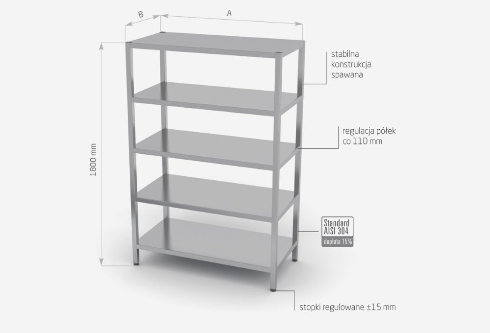 Standardowo nasze wyroby wykonane są ze stali nierdzewnej AISI 430, a elementy narażone na najsilniejsze działanie środków chemicznych i organicznych wykonujemy ze stali nierdzewnej tzw. kwasówki AISI 304. Wszystkie nasze meble mogą być również w całości wykonane z tego materiału, dopłaty do standardu AISI 304 zostały podane każdorazowo przy meblu.