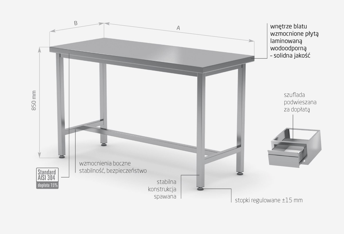 Standardowo nasze wyroby wykonane są ze stali nierdzewnej AISI 430, a elementy narażone na najsilniejsze działanie środków chemicznych i organicznych wykonujemy ze stali nierdzewnej tzw. kwasówki AISI 304. Wszystkie nasze meble mogą być również w całości wykonane z tego materiału, dopłaty do standardu AISI 304 zostały podane każdorazowo przy meblu.