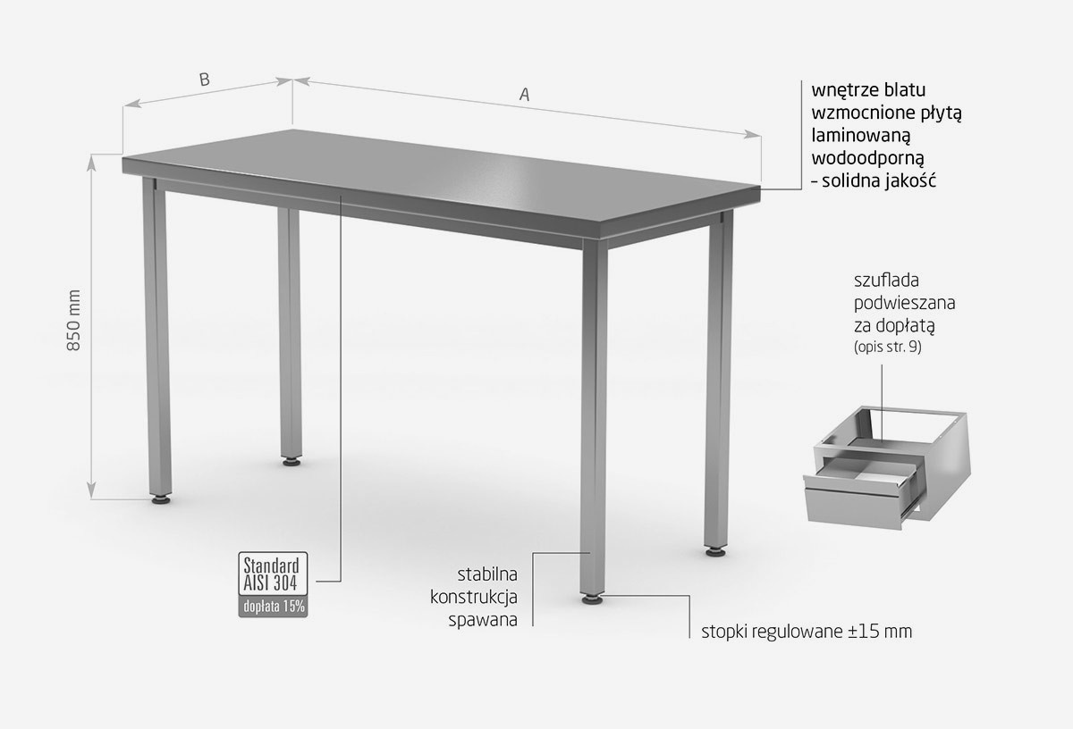 Standardowo nasze wyroby wykonane są ze stali nierdzewnej AISI 430, a elementy narażone na najsilniejsze działanie środków chemicznych i organicznych wykonujemy ze stali nierdzewnej tzw. kwasówki AISI 304. Wszystkie nasze meble mogą być również w całości wykonane z tego materiału, dopłaty do standardu AISI 304 zostały podane każdorazowo przy meblu.