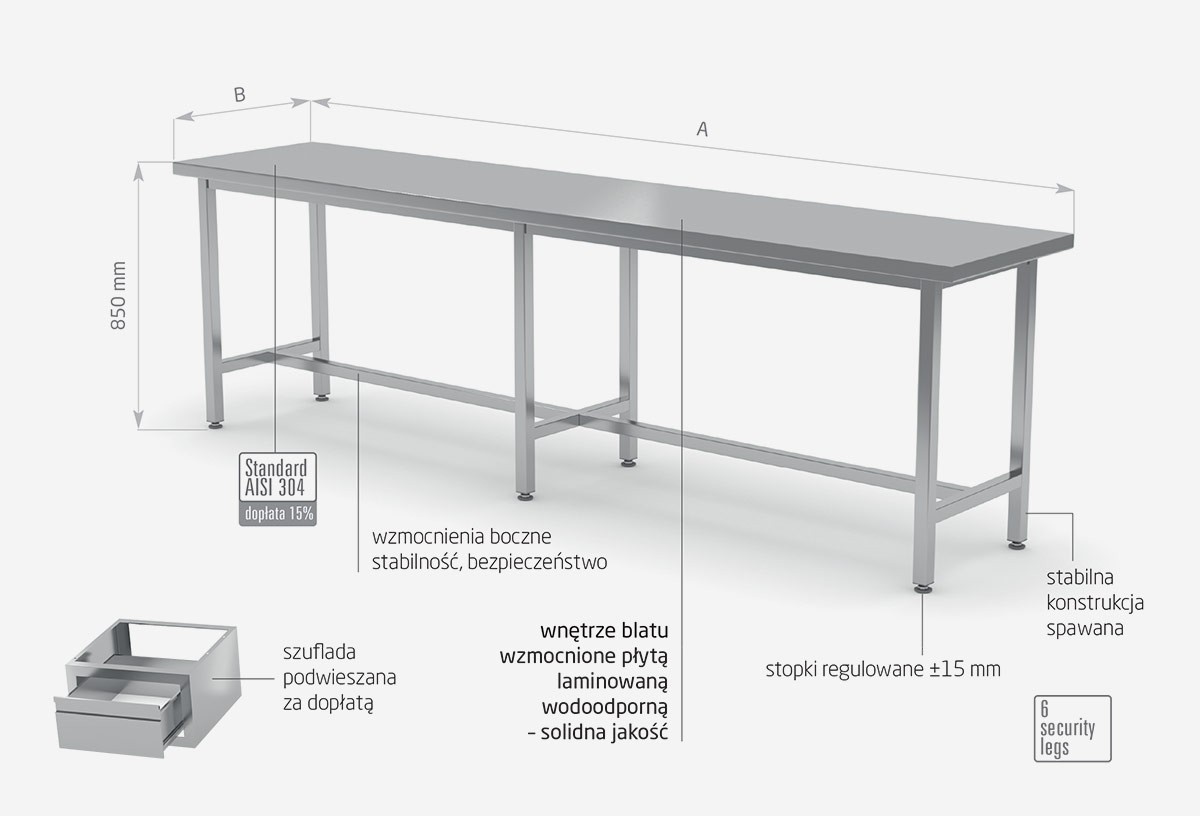 Standardowo nasze wyroby wykonane są ze stali nierdzewnej AISI 430, a elementy narażone na najsilniejsze działanie środków chemicznych i organicznych wykonujemy ze stali nierdzewnej tzw. kwasówki AISI 304. Wszystkie nasze meble mogą być również w całości wykonane z tego materiału, dopłaty do standardu AISI 304 zostały podane każdorazowo przy meblu.