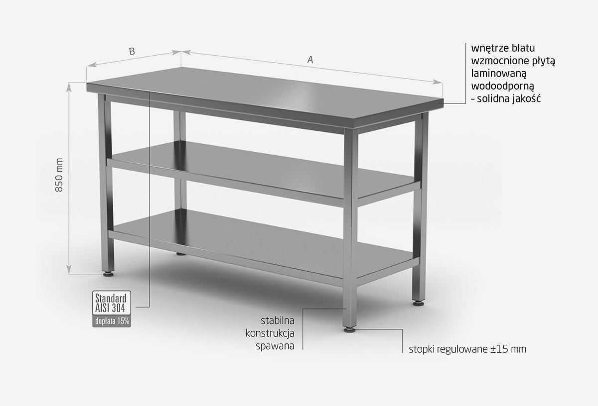 Standardowo nasze wyroby wykonane są ze stali nierdzewnej AISI 430, a elementy narażone na najsilniejsze działanie środków chemicznych i organicznych wykonujemy ze stali nierdzewnej tzw. kwasówki AISI 304. Wszystkie nasze meble mogą być również w całości wykonane z tego materiału, dopłaty do standardu AISI 304 zostały podane każdorazowo przy meblu.