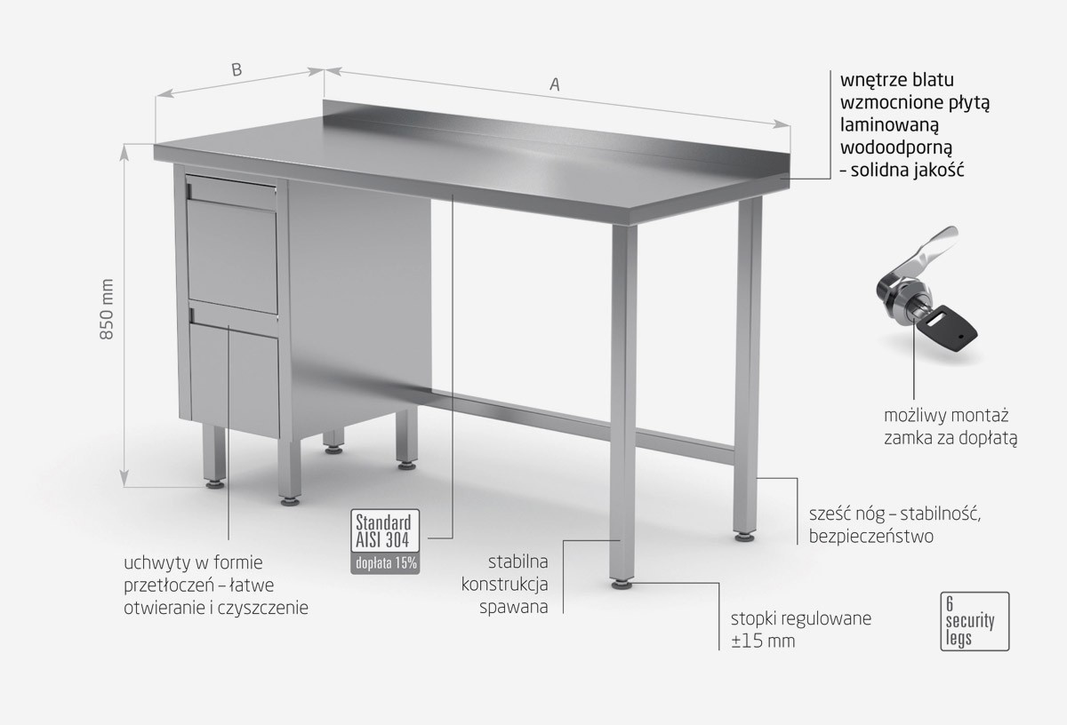 Standardowo nasze wyroby wykonane są ze stali nierdzewnej AISI 430, a elementy narażone na najsilniejsze działanie środków chemicznych i organicznych wykonujemy ze stali nierdzewnej tzw. kwasówki AISI 304. Wszystkie nasze meble mogą być również w całości wykonane z tego materiału, dopłaty do standardu AISI 304 zostały podane każdorazowo przy meblu.