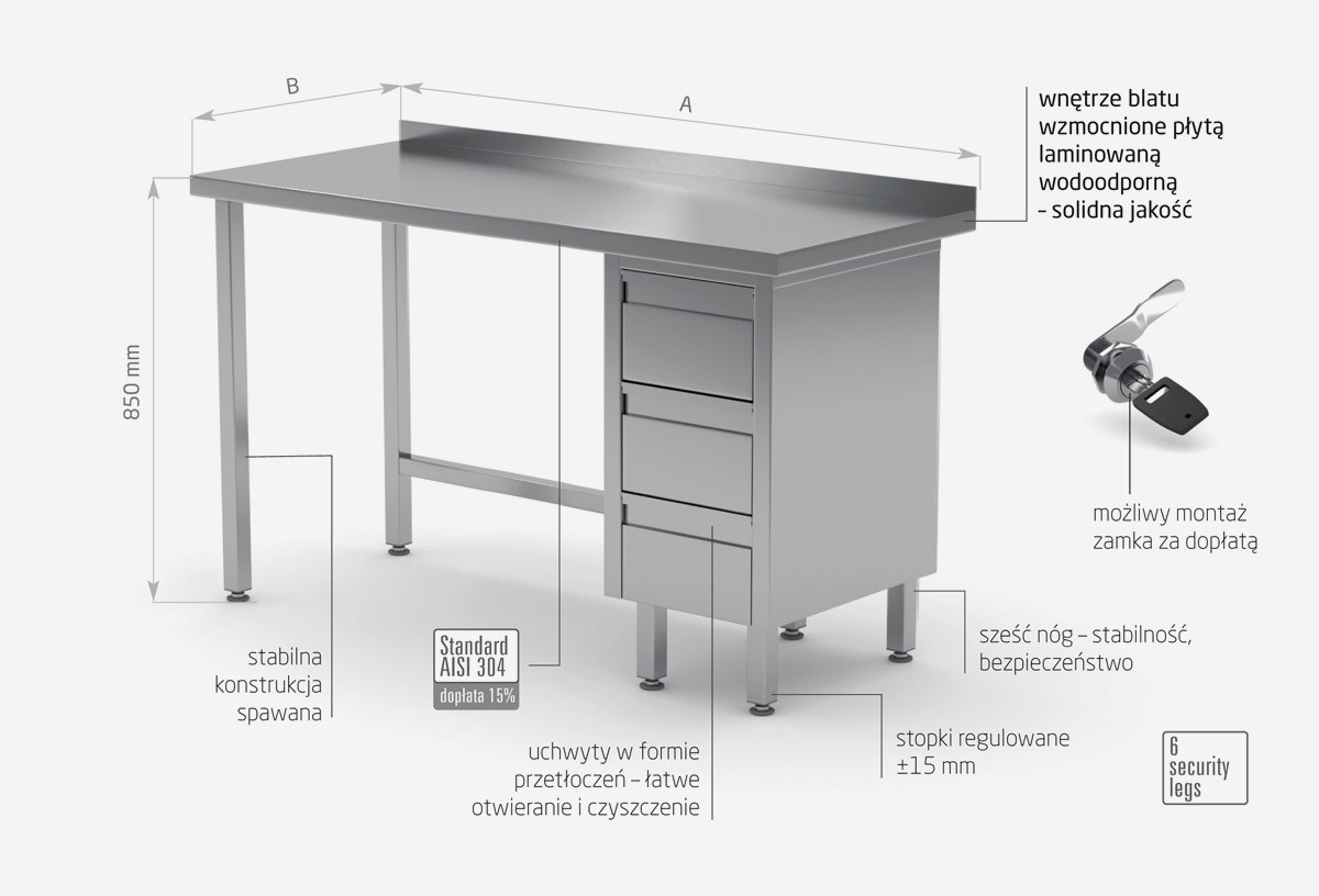 Standardowo nasze wyroby wykonane są ze stali nierdzewnej AISI 430, a elementy narażone na najsilniejsze działanie środków chemicznych i organicznych wykonujemy ze stali nierdzewnej tzw. kwasówki AISI 304. Wszystkie nasze meble mogą być również w całości wykonane z tego materiału, dopłaty do standardu AISI 304 zostały podane każdorazowo przy meblu.