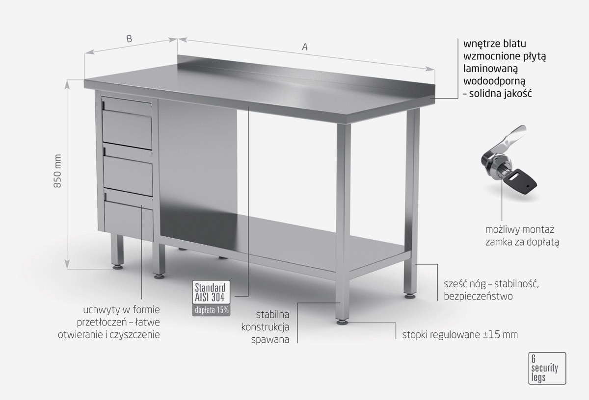 Standardowo nasze wyroby wykonane są ze stali nierdzewnej AISI 430, a elementy narażone na najsilniejsze działanie środków chemicznych i organicznych wykonujemy ze stali nierdzewnej tzw. kwasówki AISI 304. Wszystkie nasze meble mogą być również w całości wykonane z tego materiału, dopłaty do standardu AISI 304 zostały podane każdorazowo przy meblu.
