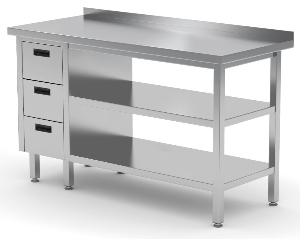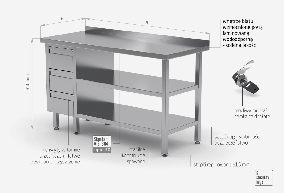 Standardowo nasze wyroby wykonane są ze stali nierdzewnej AISI 430, a elementy narażone na najsilniejsze działanie środków chemicznych i organicznych wykonujemy ze stali nierdzewnej tzw. kwasówki AISI 304. Wszystkie nasze meble mogą być również w całości wykonane z tego materiału, dopłaty do standardu AISI 304 zostały podane każdorazowo przy meblu.