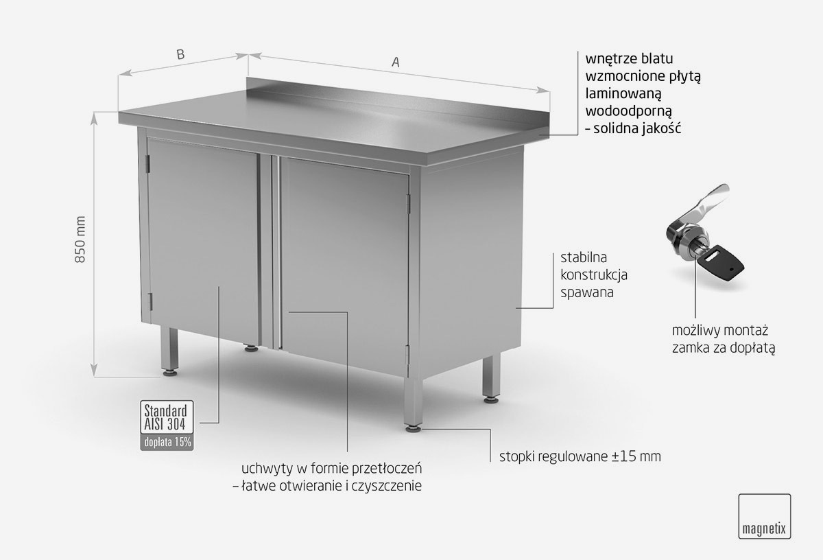 Standardowo nasze wyroby wykonane są ze stali nierdzewnej AISI 430, a elementy narażone na najsilniejsze działanie środków chemicznych i organicznych wykonujemy ze stali nierdzewnej tzw. kwasówki AISI 304. Wszystkie nasze meble mogą być również w całości wykonane z tego materiału, dopłaty do standardu AISI 304 zostały podane każdorazowo przy meblu.