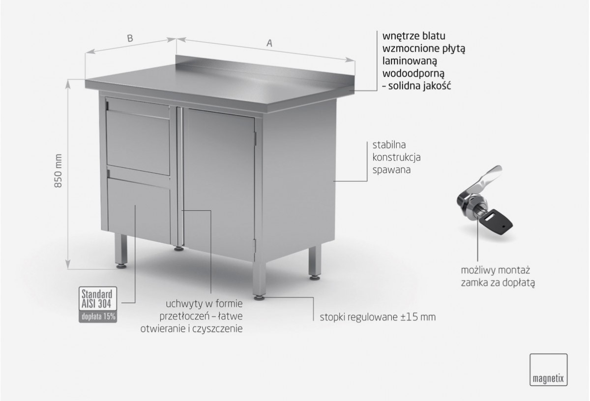 Standardowo nasze wyroby wykonane są ze stali nierdzewnej AISI 430, a elementy narażone na najsilniejsze działanie środków chemicznych i organicznych wykonujemy ze stali nierdzewnej tzw. kwasówki AISI 304. Wszystkie nasze meble mogą być również w całości wykonane z tego materiału, dopłaty do standardu AISI 304 zostały podane każdorazowo przy meblu.