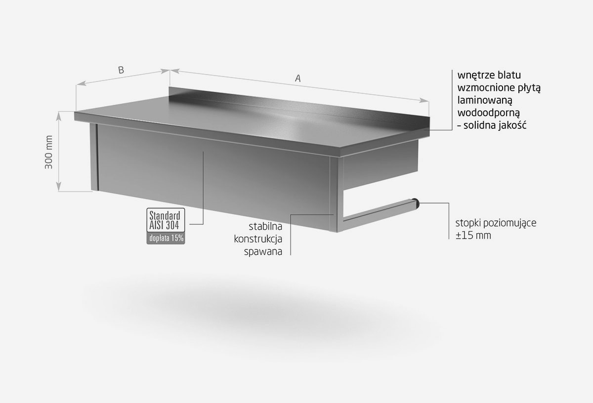Standardowo nasze wyroby wykonane są ze stali nierdzewnej AISI 430, a elementy narażone na najsilniejsze działanie środków chemicznych i organicznych wykonujemy ze stali nierdzewnej tzw. kwasówki AISI 304. Wszystkie nasze meble mogą być również w całości wykonane z tego materiału, dopłaty do standardu AISI 304 zostały podane każdorazowo przy meblu.