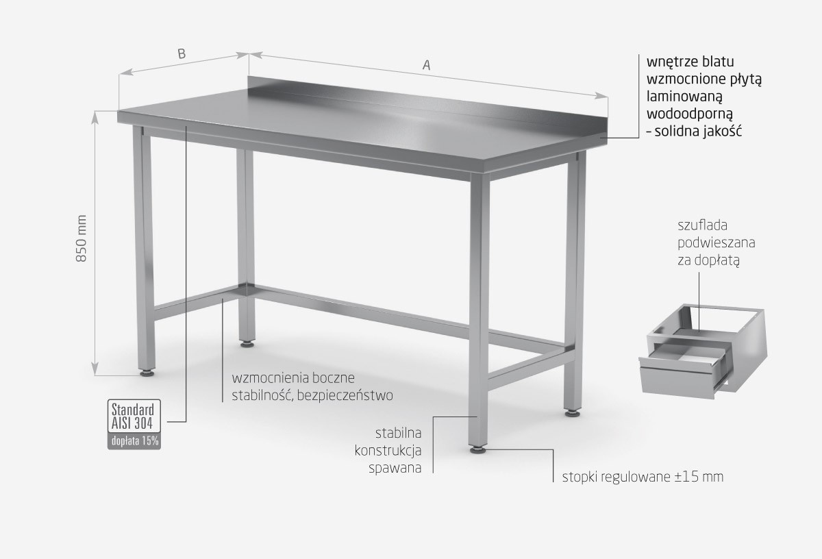 Standardowo nasze wyroby wykonane są ze stali nierdzewnej AISI 430, a elementy narażone na najsilniejsze działanie środków chemicznych i organicznych wykonujemy ze stali nierdzewnej tzw. kwasówki AISI 304. Wszystkie nasze meble mogą być również w całości wykonane z tego materiału, dopłaty do standardu AISI 304 zostały podane każdorazowo przy meblu.