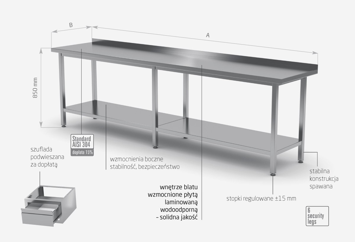 Standardowo nasze wyroby wykonane są ze stali nierdzewnej AISI 430, a elementy narażone na najsilniejsze działanie środków chemicznych i organicznych wykonujemy ze stali nierdzewnej tzw. kwasówki AISI 304. Wszystkie nasze meble mogą być również w całości wykonane z tego materiału, dopłaty do standardu AISI 304 zostały podane każdorazowo przy meblu.