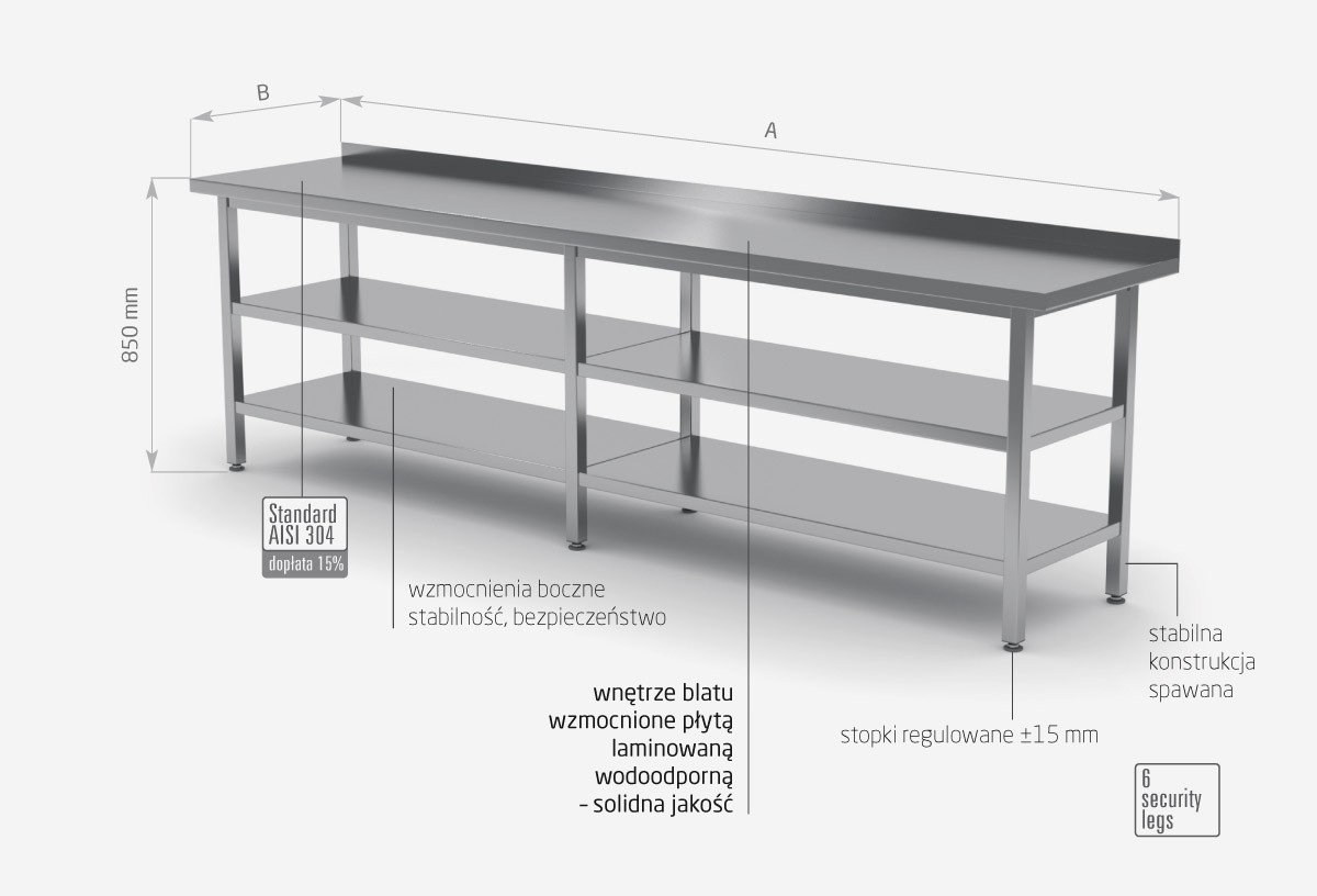 Standardowo nasze wyroby wykonane są ze stali nierdzewnej AISI 430, a elementy narażone na najsilniejsze działanie środków chemicznych i organicznych wykonujemy ze stali nierdzewnej tzw. kwasówki AISI 304. Wszystkie nasze meble mogą być również w całości wykonane z tego materiału, dopłaty do standardu AISI 304 zostały podane każdorazowo przy meblu.