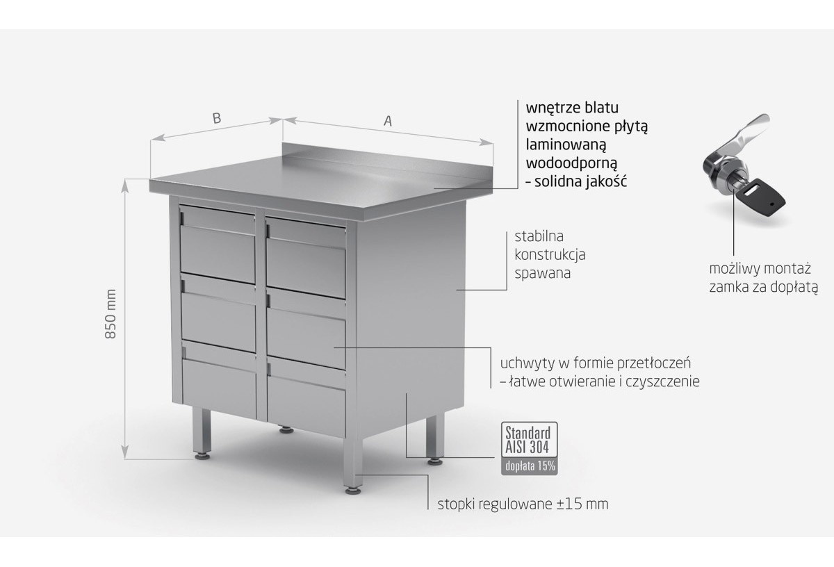 Standardowo nasze wyroby wykonane są ze stali nierdzewnej AISI 430, a elementy narażone na najsilniejsze działanie środków chemicznych i organicznych wykonujemy ze stali nierdzewnej tzw. kwasówki AISI 304. Wszystkie nasze meble mogą być również w całości wykonane z tego materiału, dopłaty do standardu AISI 304 zostały podane każdorazowo przy meblu.
