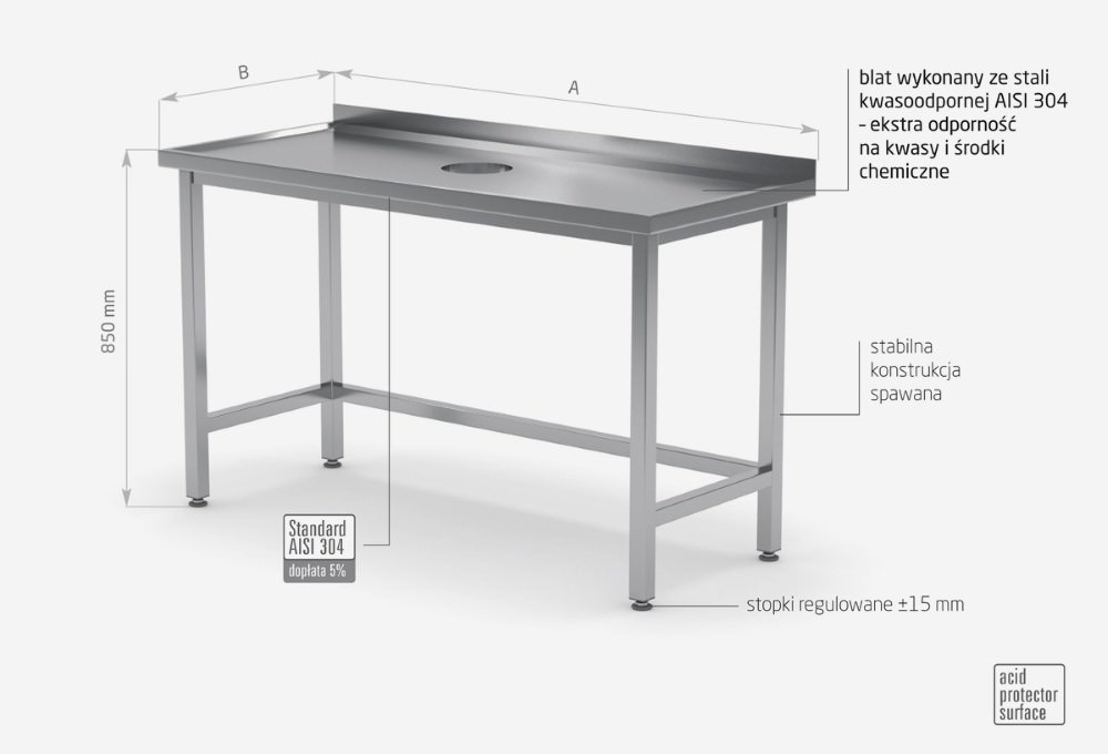 Standardowo nasze wyroby wykonane są ze stali nierdzewnej AISI 430, a elementy narażone na najsilniejsze działanie środków chemicznych i organicznych wykonujemy ze stali nierdzewnej tzw. kwasówki AISI 304. Wszystkie nasze meble mogą być również w całości wykonane z tego materiału, dopłaty do standardu AISI 304 zostały podane każdorazowo przy meblu.