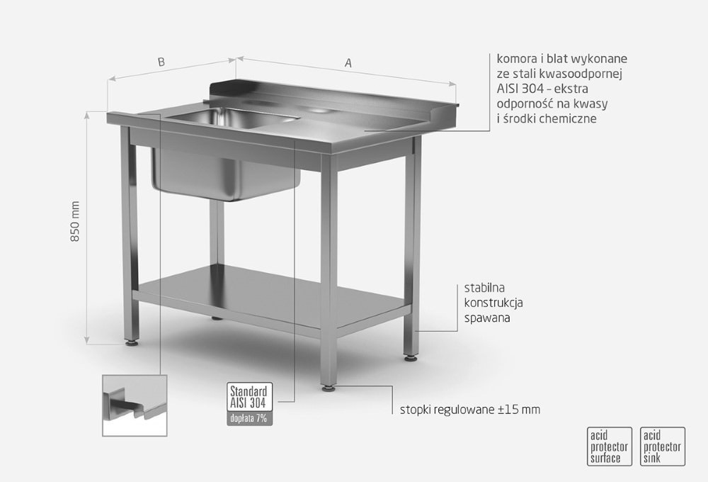 Standardowo nasze wyroby wykonane są ze stali nierdzewnej AISI 430, a elementy narażone na najsilniejsze działanie środków chemicznych i organicznych wykonujemy ze stali nierdzewnej tzw. kwasówki AISI 304. Wszystkie nasze meble mogą być również w całości wykonane z tego materiału, dopłaty do standardu AISI 304 zostały podane każdorazowo przy meblu.