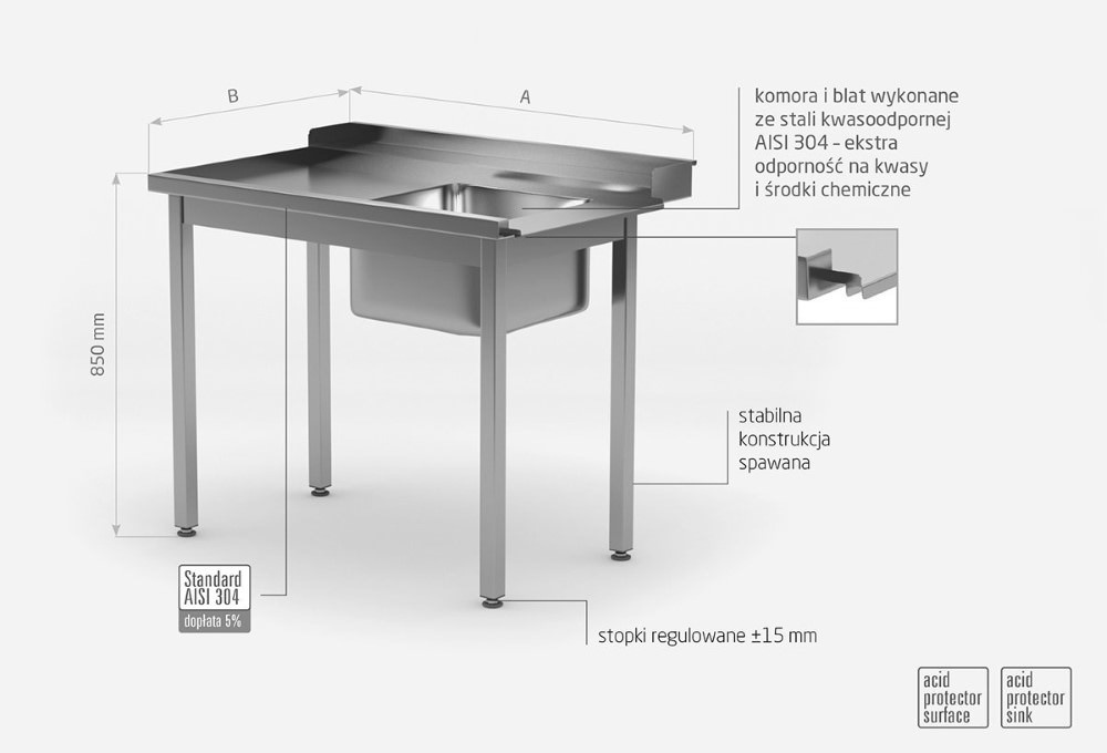 Standardowo nasze wyroby wykonane są ze stali nierdzewnej AISI 430, a elementy narażone na najsilniejsze działanie środków chemicznych i organicznych wykonujemy ze stali nierdzewnej tzw. kwasówki AISI 304. Wszystkie nasze meble mogą być również w całości wykonane z tego materiału, dopłaty do standardu AISI 304 zostały podane każdorazowo przy meblu.