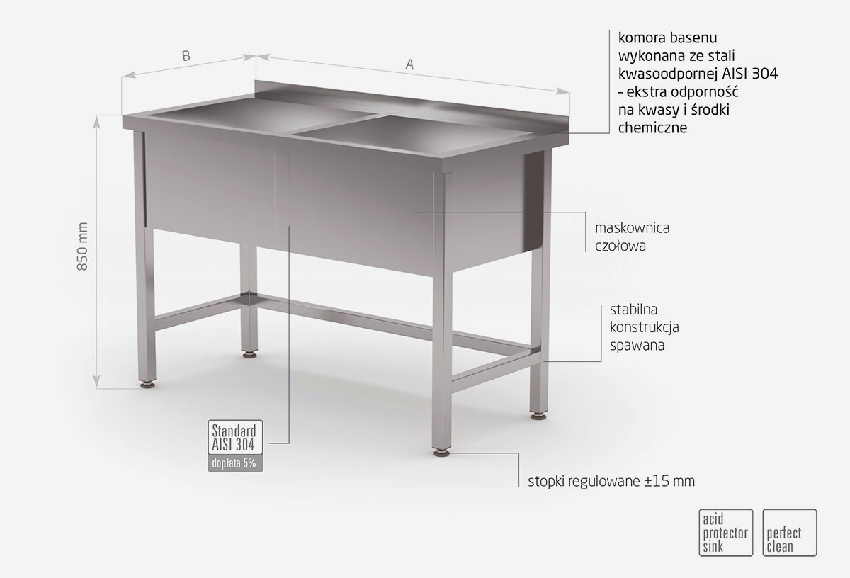 Standardowo nasze wyroby wykonane są ze stali nierdzewnej AISI 430, a elementy narażone na najsilniejsze działanie środków chemicznych i organicznych wykonujemy ze stali nierdzewnej tzw. kwasówki AISI 304. Wszystkie nasze meble mogą być również w całości wykonane z tego materiału, dopłaty do standardu AISI 304 zostały podane każdorazowo przy meblu.