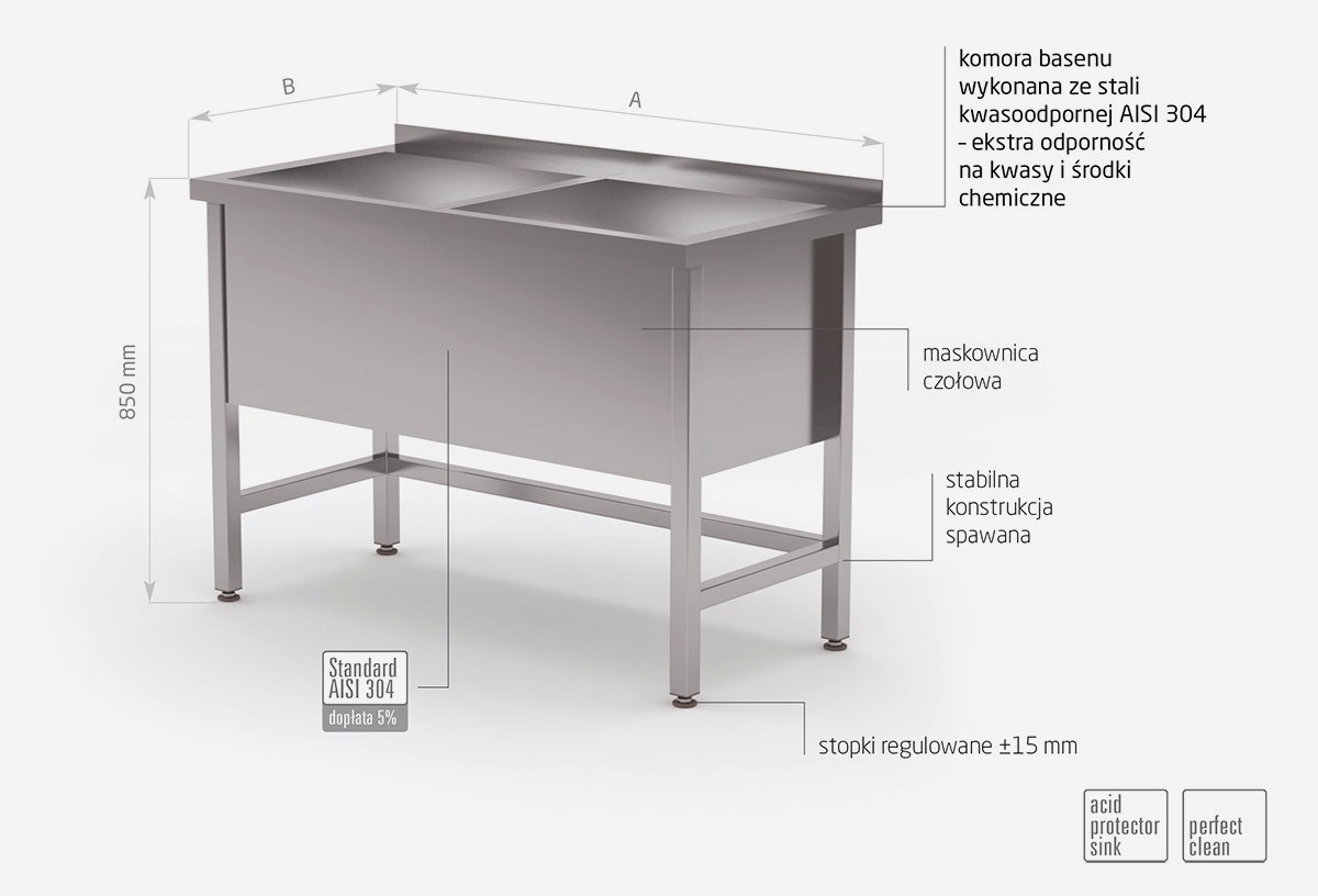 Standardowo nasze wyroby wykonane są ze stali nierdzewnej AISI 430, a elementy narażone na najsilniejsze działanie środków chemicznych i organicznych wykonujemy ze stali nierdzewnej tzw. kwasówki AISI 304. Wszystkie nasze meble mogą być również w całości wykonane z tego materiału, dopłaty do standardu AISI 304 zostały podane każdorazowo przy meblu.