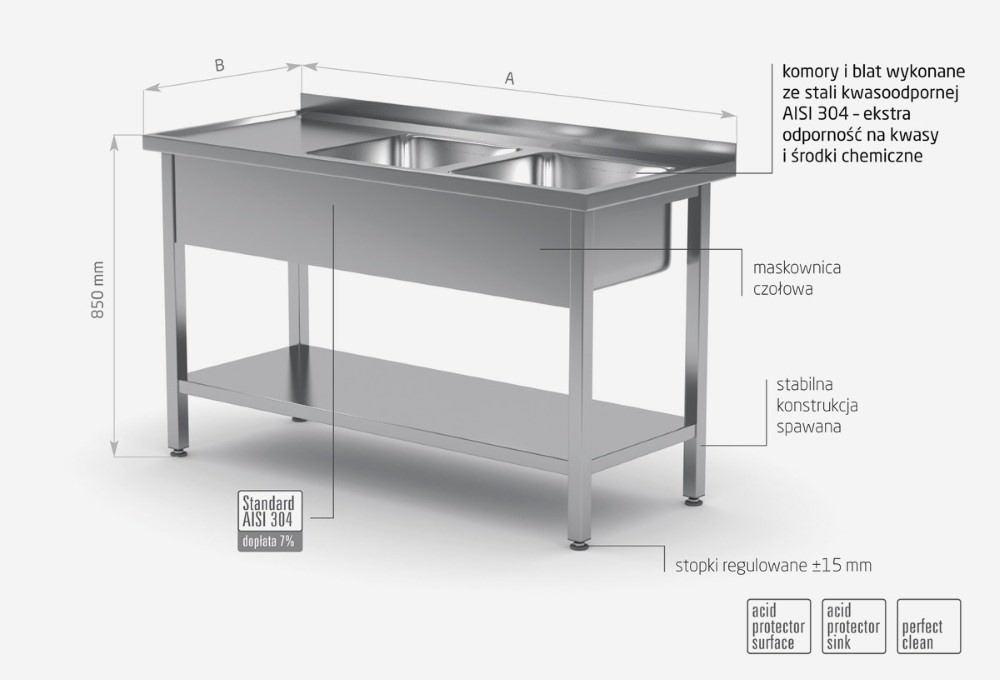 Standardowo nasze wyroby wykonane są ze stali nierdzewnej AISI 430, a elementy narażone na najsilniejsze działanie środków chemicznych i organicznych wykonujemy ze stali nierdzewnej tzw. kwasówki AISI 304. Wszystkie nasze meble mogą być również w całości wykonane z tego materiału, dopłaty do standardu AISI 304 zostały podane każdorazowo przy meblu.
