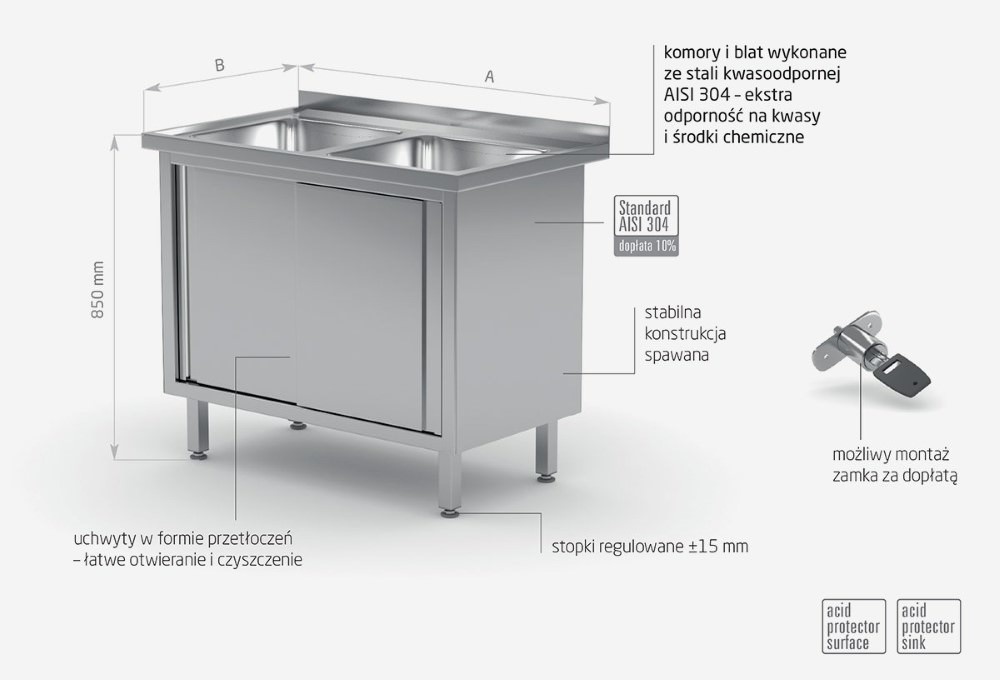 Standardowo nasze wyroby wykonane są ze stali nierdzewnej AISI 430, a elementy narażone na najsilniejsze działanie środków chemicznych i organicznych wykonujemy ze stali nierdzewnej tzw. kwasówki AISI 304. Wszystkie nasze meble mogą być również w całości wykonane z tego materiału, dopłaty do standardu AISI 304 zostały podane każdorazowo przy meblu.