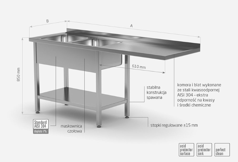 Standardowo nasze wyroby wykonane są ze stali nierdzewnej AISI 430, a elementy narażone na najsilniejsze działanie środków chemicznych i organicznych wykonujemy ze stali nierdzewnej tzw. kwasówki AISI 304. Wszystkie nasze meble mogą być również w całości wykonane z tego materiału, dopłaty do standardu AISI 304 zostały podane każdorazowo przy meblu.