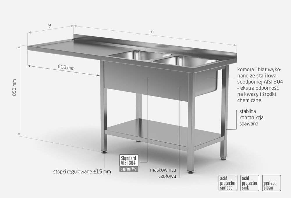 Standardowo nasze wyroby wykonane są ze stali nierdzewnej AISI 430, a elementy narażone na najsilniejsze działanie środków chemicznych i organicznych wykonujemy ze stali nierdzewnej tzw. kwasówki AISI 304. Wszystkie nasze meble mogą być również w całości wykonane z tego materiału, dopłaty do standardu AISI 304 zostały podane każdorazowo przy meblu.