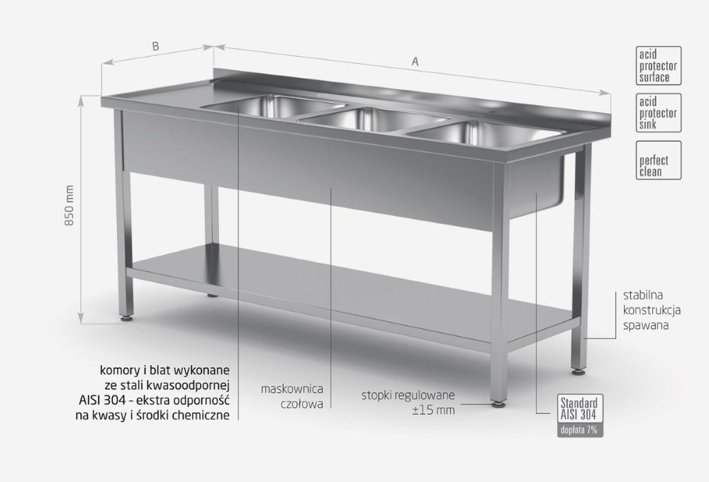 Standardowo nasze wyroby wykonane są ze stali nierdzewnej AISI 430, a elementy narażone na najsilniejsze działanie środków chemicznych i organicznych wykonujemy ze stali nierdzewnej tzw. kwasówki AISI 304. Wszystkie nasze meble mogą być również w całości wykonane z tego materiału, dopłaty do standardu AISI 304 zostały podane każdorazowo przy meblu.