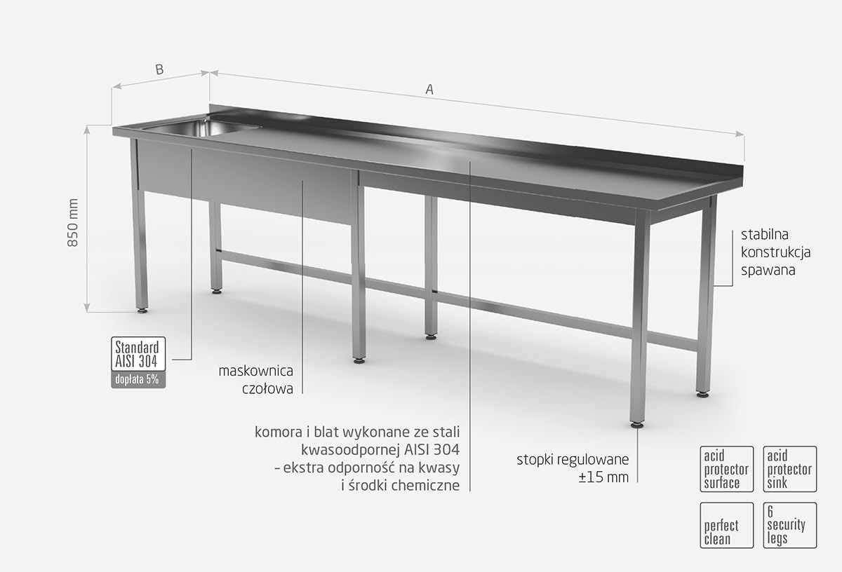 Standardowo nasze wyroby wykonane są ze stali nierdzewnej AISI 430, a elementy narażone na najsilniejsze działanie środków chemicznych i organicznych wykonujemy ze stali nierdzewnej tzw. kwasówki AISI 304. Wszystkie nasze meble mogą być również w całości wykonane z tego materiału, dopłaty do standardu AISI 304 zostały podane każdorazowo przy meblu.