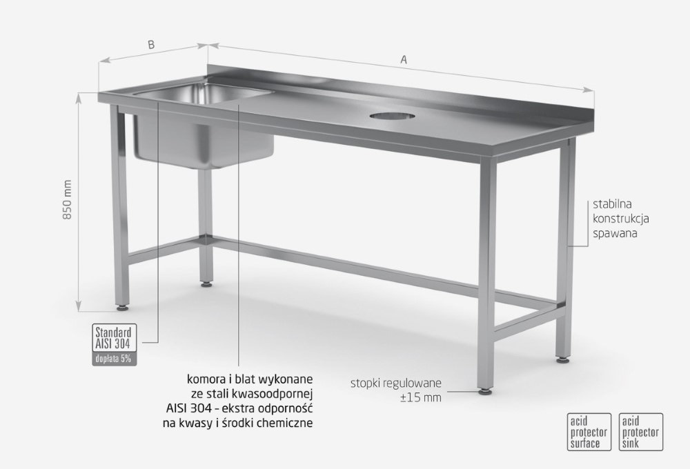 Standardowo nasze wyroby wykonane są ze stali nierdzewnej AISI 430, a elementy narażone na najsilniejsze działanie środków chemicznych i organicznych wykonujemy ze stali nierdzewnej tzw. kwasówki AISI 304. Wszystkie nasze meble mogą być również w całości wykonane z tego materiału, dopłaty do standardu AISI 304 zostały podane każdorazowo przy meblu.