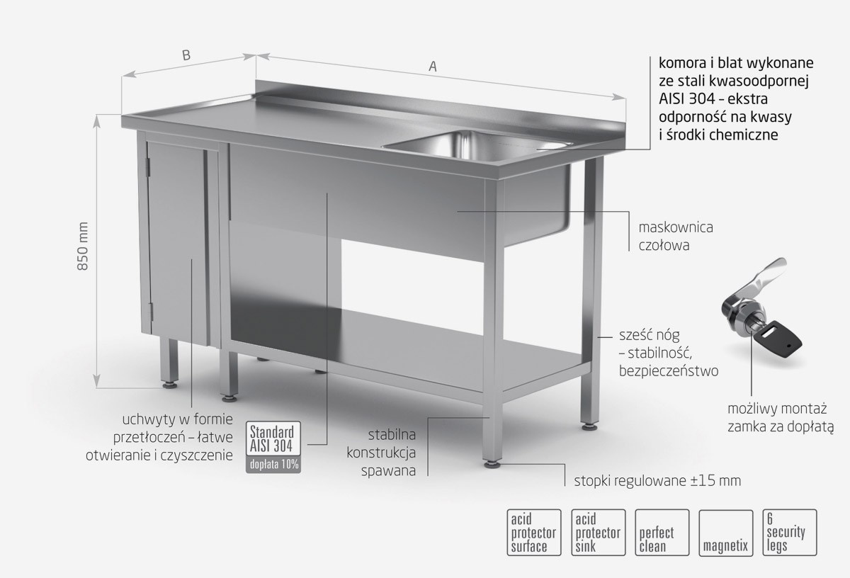 Standardowo nasze wyroby wykonane są ze stali nierdzewnej AISI 430, a elementy narażone na najsilniejsze działanie środków chemicznych i organicznych wykonujemy ze stali nierdzewnej tzw. kwasówki AISI 304. Wszystkie nasze meble mogą być również w całości wykonane z tego materiału, dopłaty do standardu AISI 304 zostały podane każdorazowo przy meblu.