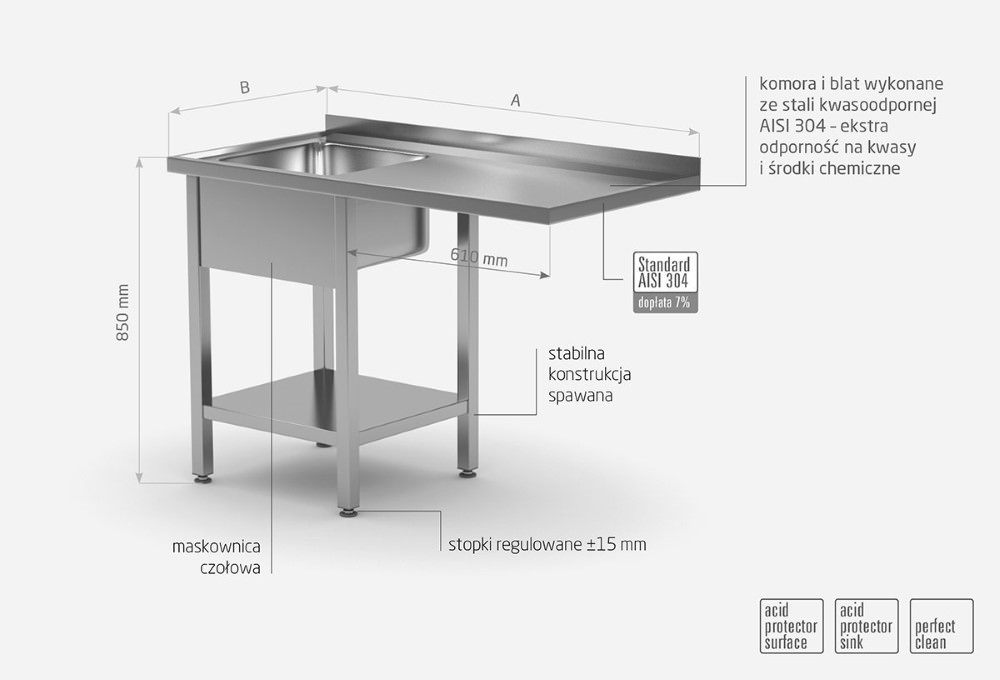 Standardowo nasze wyroby wykonane są ze stali nierdzewnej AISI 430, a elementy narażone na najsilniejsze działanie środków chemicznych i organicznych wykonujemy ze stali nierdzewnej tzw. kwasówki AISI 304. Wszystkie nasze meble mogą być również w całości wykonane z tego materiału, dopłaty do standardu AISI 304 zostały podane każdorazowo przy meblu.