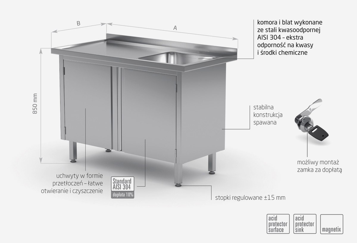 Standardowo nasze wyroby wykonane są ze stali nierdzewnej AISI 430, a elementy narażone na najsilniejsze działanie środków chemicznych i organicznych wykonujemy ze stali nierdzewnej tzw. kwasówki AISI 304. Wszystkie nasze meble mogą być również w całości wykonane z tego materiału, dopłaty do standardu AISI 304 zostały podane każdorazowo przy meblu.