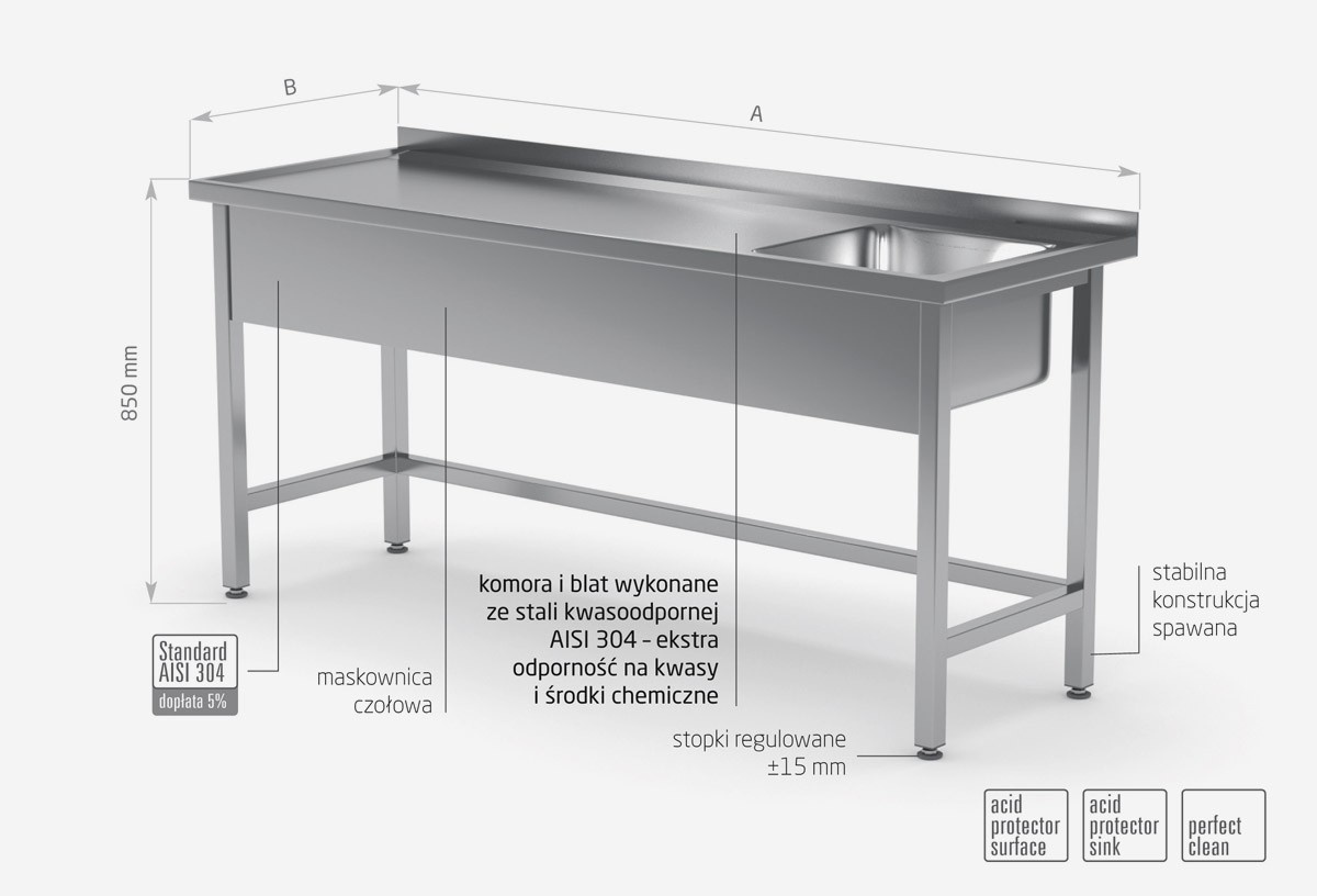 Standardowo nasze wyroby wykonane są ze stali nierdzewnej AISI 430, a elementy narażone na najsilniejsze działanie środków chemicznych i organicznych wykonujemy ze stali nierdzewnej tzw. kwasówki AISI 304. Wszystkie nasze meble mogą być również w całości wykonane z tego materiału, dopłaty do standardu AISI 304 zostały podane każdorazowo przy meblu.