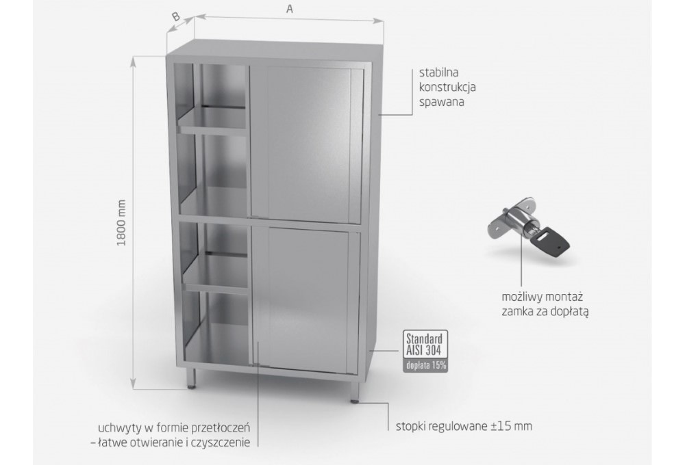 Standardowo nasze wyroby wykonane są ze stali nierdzewnej AISI 430, a elementy narażone na najsilniejsze działanie środków chemicznych i organicznych wykonujemy ze stali nierdzewnej tzw. kwasówki AISI 304. Wszystkie nasze meble mogą być również w całości wykonane z tego materiału, dopłaty do standardu AISI 304 zostały podane każdorazowo przy meblu.