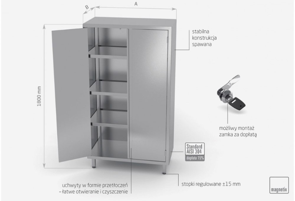 Standardowo nasze wyroby wykonane są ze stali nierdzewnej AISI 430, a elementy narażone na najsilniejsze działanie środków chemicznych i organicznych wykonujemy ze stali nierdzewnej tzw. kwasówki AISI 304. Wszystkie nasze meble mogą być również w całości wykonane z tego materiału, dopłaty do standardu AISI 304 zostały podane każdorazowo przy meblu.