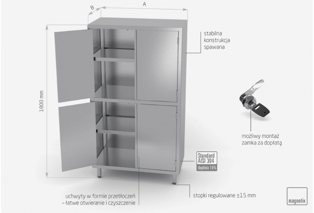 Standardowo nasze wyroby wykonane są ze stali nierdzewnej AISI 430, a elementy narażone na najsilniejsze działanie środków chemicznych i organicznych wykonujemy ze stali nierdzewnej tzw. kwasówki AISI 304. Wszystkie nasze meble mogą być również w całości wykonane z tego materiału, dopłaty do standardu AISI 304 zostały podane każdorazowo przy meblu.