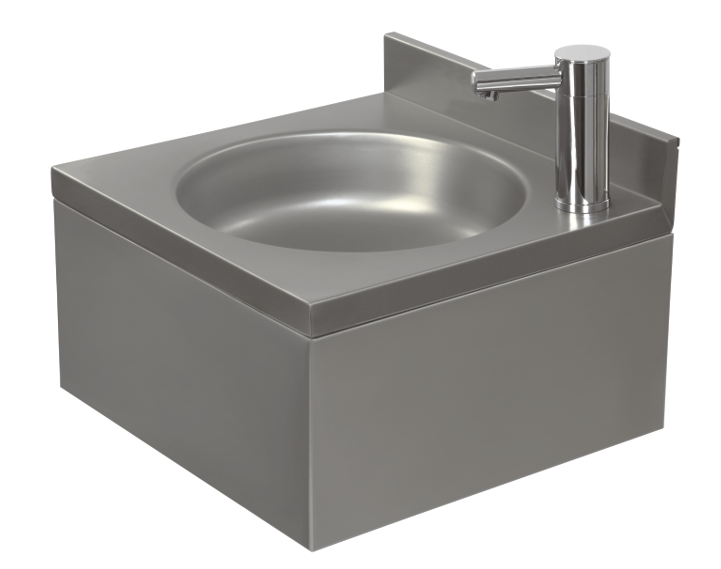Umywalka ze stali nierdzewnej, jednokomorowa, obudowana, z zamontowaną baterią umywalkową elektroniczną, stojącą, z ręcznym mieszaczem wody zimnej i gorącej pod umywalką. Zasilanie baterii elektronicznej z zasilacza 230/6V. Wymiary umywalki (dł x szer x wys) 400 x 400 x 220 mm. Głębokość komory 120 mm. Grubość blachy: 1,0 mm. W komplecie zestaw mocujący do ściany oraz syfon.